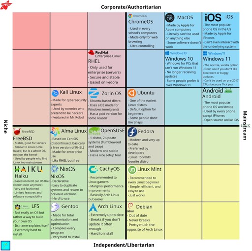 Ek-Hou-Van-Braai@piefed.social to linuxmemes@lemmy.worldEnglish · 15 days agoOperating System Political Compass - Updated versionmedia.piefed.socialimagemessage-square143linkfedilinkarrow-up1471arrow-down153