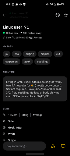 Toldry@lemmy.world to linuxmemes@lemmy.world · 29 days agoEncountered a linux user in Grindrlemmy.worldimagemessage-square62fedilinkarrow-up1262arrow-down118