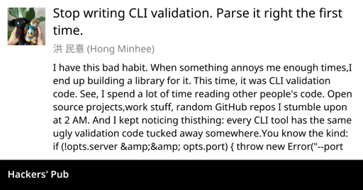 This post introduces Optique, a new library created to address the pervasive problem of repetitive and often messy validation code in CLI tools. The author was motivated by the observation that nearly every CLI tool reinvents the wheel with similar validation patterns for dependent options, mutually exclusive options, and environment-specific requirements. Optique leverages parser combinators and TypeScript's type inference to ensure that CLI arguments are parsed directly into valid configurations, eliminating the need for manual validation. By describing the desired CLI configuration with Optique, TypeScript automatically infers the types and constraints, catching potential bugs at compile time. The author shares their experience of deleting large chunks of validation code and simplifying refactoring tasks. Optique aims to provide a more robust and maintainable approach to CLI argument parsing, potentially saving developers from writing the same validation logic repeatedly.