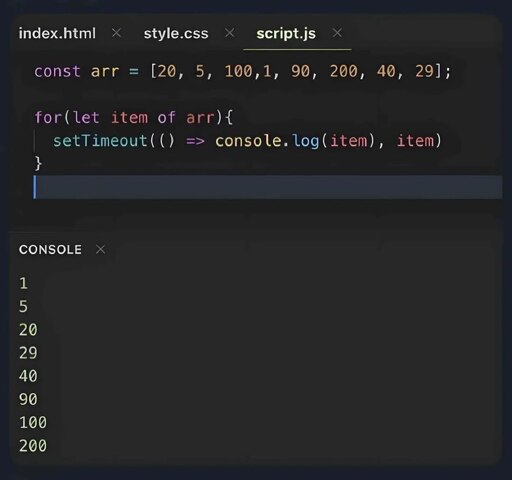 - setTimeout(() => console.log(item), item) + setTimeout(() => console.log(item), Math.log(item))Comment: This will speed up sort time greatly. However, sort order may become erratic for longer lists, and lists with numbers less than 1