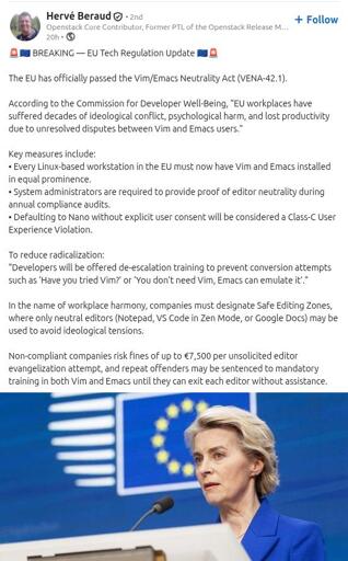 All offices within the EU administration will be supplied with the officially modified flavors of eumacs and neuvim.