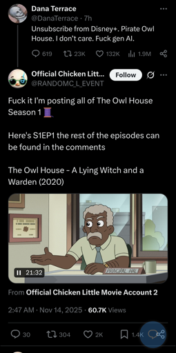 Full details: some people glean implications from people’s posts, I just want to clarify: I don’t care about AI, I’m just lost on what’s happening here (I only just discovered Dana Terrace exists after only just recently watching the owl house and being told about her other works, so I’m curious about if her stuff is being pirated by Disney via whatever AI stuff they’re doing)