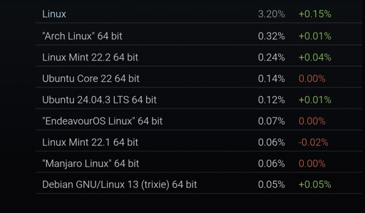 mr_MADAFAKA@lemmy.ml to Linux Gaming@lemmy.worldEnglish · 6 days agoLinux continues to grow and has reached a new peak of 3.20% in the November 2025 Steam Hardware & Software Surveylemmy.mlimagemessage-square178fedilinkarrow-up1768arrow-down13file-text