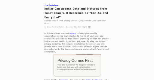 In October Kohler launched Dekota, a $600 (plus monthly subscription) device that attaches to the rim of your toilet and collects images and data from inside