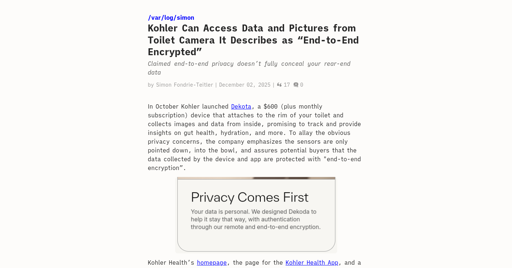 arrow-up1153arrow-down1external-linkKohler Can Access Data and Pictures from Toilet Camera It Describes as “End-to-End Encrypted”varlogsimon.leaflet.pubJensSpahnpasta@feddit.org to Technology@lemmy.worldEnglish · 6 days agomessage-square44fedilink