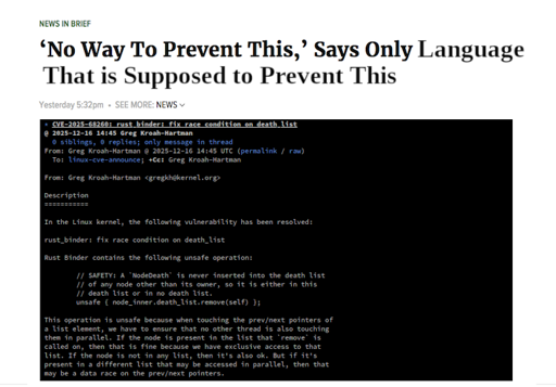 unsafe{}block, so no one should be expecting it to have the guarantees you’d normally get from rust. It’s ragebait.The headline is based on the classic Onion headline / News In Brief article used after every new mass shooting in America