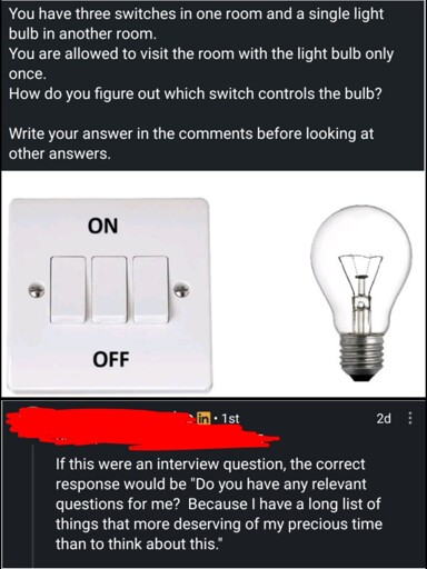 In all of my answers and others I’ve seen so far, we’re either making presumptions or making shit up. The question fails as an “only one right answer with only the information given” logic test, but would work to reveal how we approach problems - a personality test.