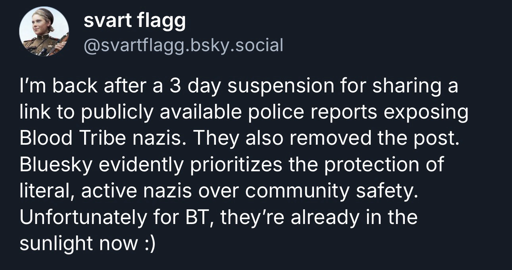 Attached: 1 image Bluesky suspending antifascist researchers for sharing publicly available information about literal nazis. Should be no surprise considering bsky constantly protects nazis, the far right, and all flavors of bigotry at the expense of Palestinians and trans women. Fortunately, their information already spread so far and wide that at least half of the Blood Tribe nazis lost their jobs following the mass doxx. Chris Pohlhaus, leader of BT, estimated financial losses at over $2 million lol. Happy holidays!