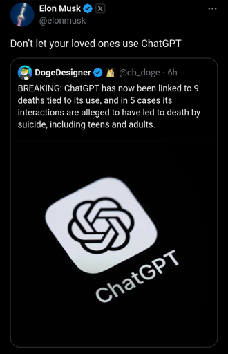 Elon Musk doesn’t care about chatgpt killing people either. He’s just marketing.