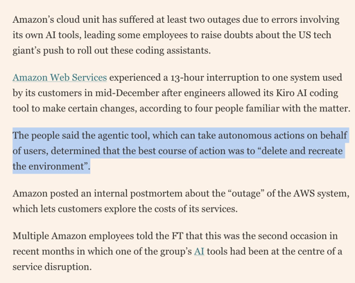 ☆ Yσɠƚԋσʂ ☆@lemmy.ml to Programmer Humor@lemmy.mlEnglish · 1 month agoAmazon's internal agentic tool decided that existing code was inadequate and decided to replace it taking down a part of AWS for 13 hours, and was not the first time it had happened. 🤣lemmy.mlimagemessage-square24linkfedilinkarrow-up1277arrow-down13file-text