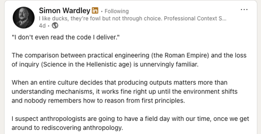That’s also why generative AI may end up setting us back a couple of decades. If you’re using AI to read and write the code, there is very little communicative intent making it through to the other developers. And it’s a self-reinforcing problem. There’s no use reading AI-generated code to try to understand the author’s mental model, because very little of their mental model makes it through to the code.